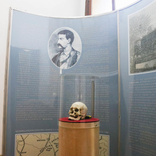 Iznad lobanje nalazi se Sinđelićev portret i zapis o toku njegove odsudne bitke na Čegru.
