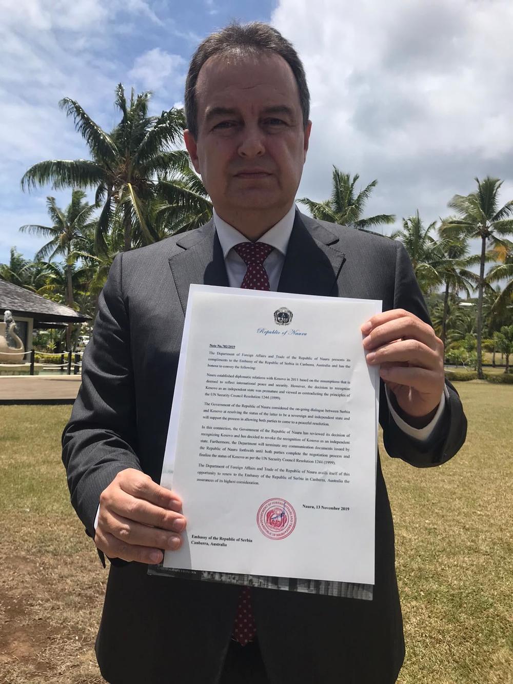 Republika Nauru je 17. država koja je povukla priznanje jednostrano proglašene nezavisnosti takozvanog Kosova. Danas mi je zamenik ministra spoljnih poslova Naurua uručio primerak note koju su uputili našoj Ambasadi u Australiji.
