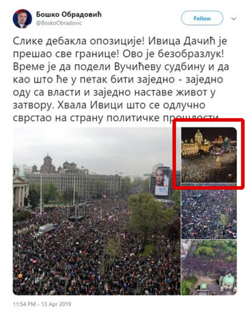 "Slike debakla opozicije! Ivica Dačić je prešao sve granice! Ovo je bezobrazluk! Vreme je da podeli Vučićevu sudbinu i da kao što će u petak biti zajedno - zajedno odu sa vlasti i zajedno nastave život u zatvoru. Hvala Ivici što se odlučno svrstao na stranu političke prošlosti", napisao je Obradović na Tviteru.