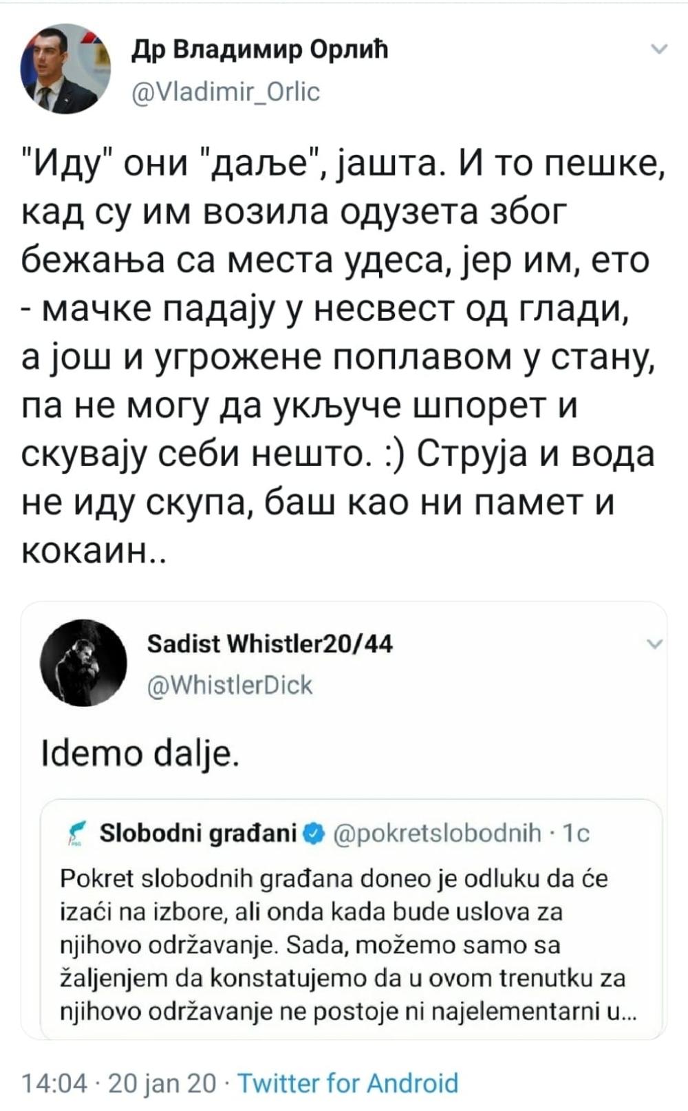 - "Idu" oni "dalje", jašta. I to peške, kad su im vozila oduzeta zbog bežanja sa mesta udesa, jer im, eto - mačke padaju u nesvest od gladi, a još i ugrožene poplavom u stanu, pa ne mogu da uključe šporet i skuvaju sebi nešto. :) Struja i voda ne idu skupa, baš kao ni pamet i kokain... - napisao je Orlić.