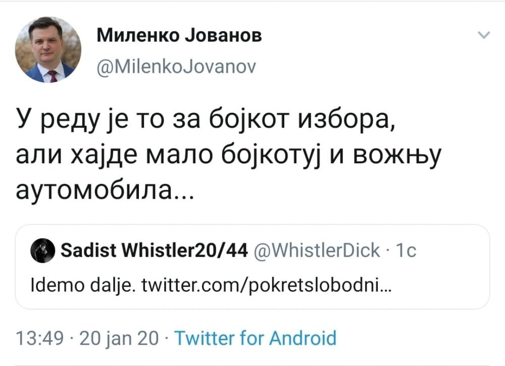 Potpredsednik SNS Milenko Jovanov prokomentarisao je danas na Tviteru odluku Sergeja Trifunovića da Pokret slobodnih građana bojkotuje predstojeće izbore u Srbiji...