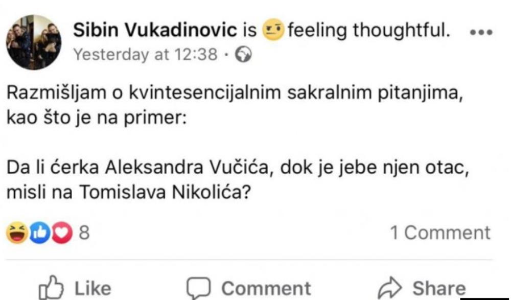 Izvesni Sibin Vukadinović, za kojeg mediji navode da je "saradnik" Boška Obradovića, napisao je, naime, na svom profilu, ovo, i to na račun maloletne ćerke Aleksandra Vučića: