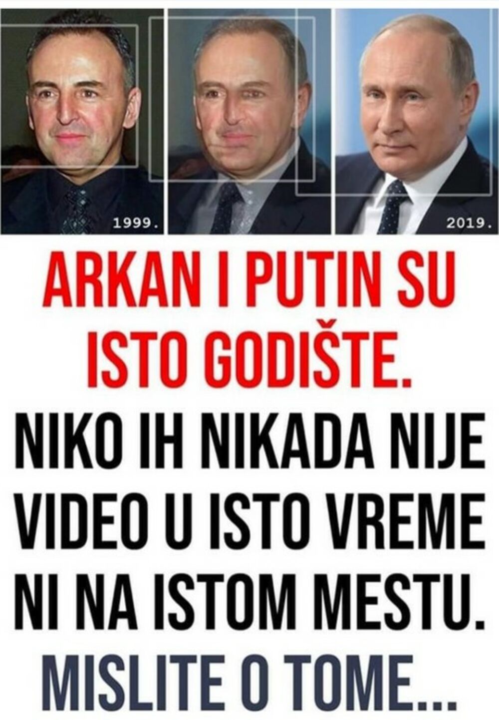E, sad, vezano za ovu tezu, jeste i još jedna neverovatnija priča, a to je da su pokojni Željko Ražnatović Arkan i Vladimir Putin zapravo ista osoba, što se može videti i na ovoj ilustraciji.