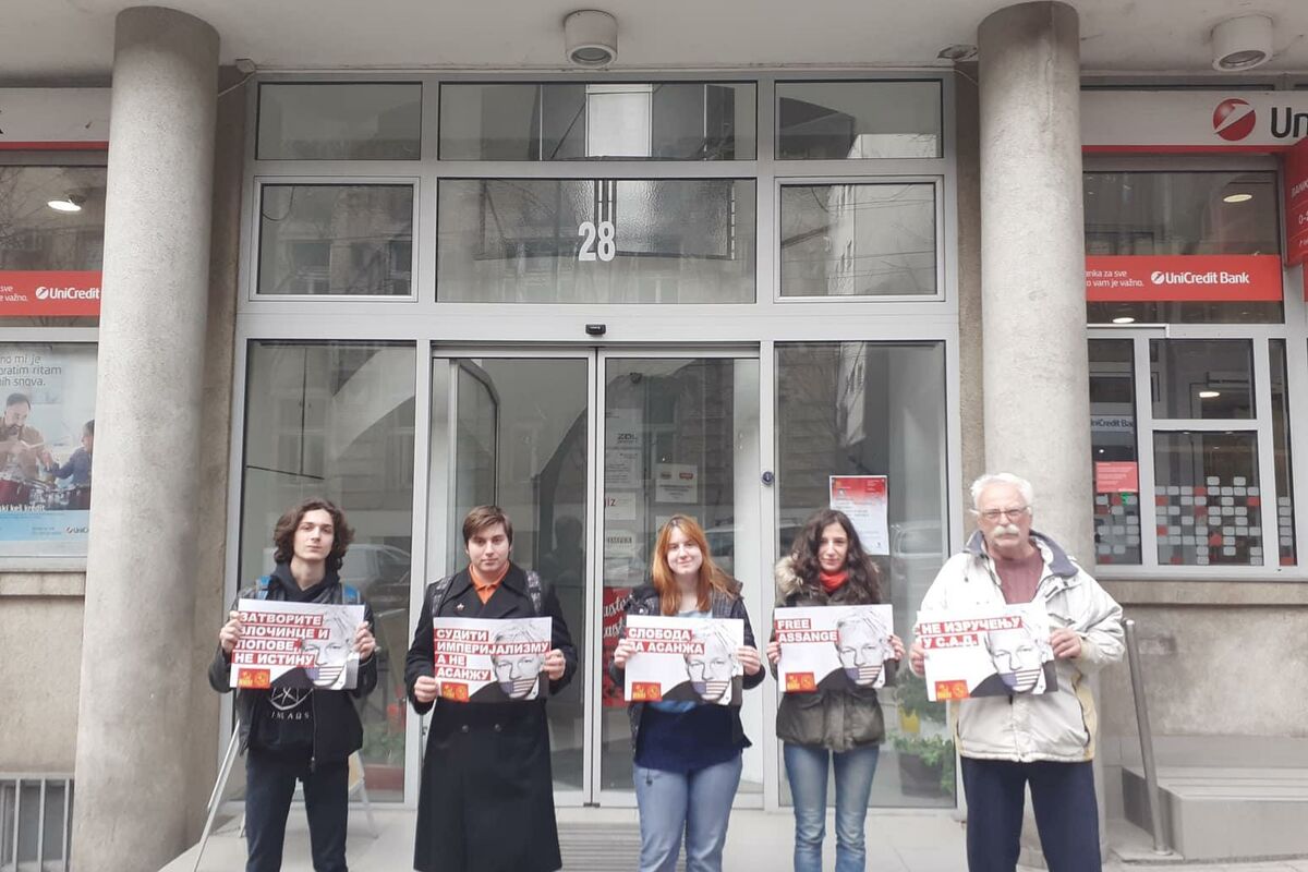 Aktivisti SKOJ-a su svojim prisustvom ispred zgrade novinarskih udruženja Srbije pružili simboličnu podršku Asanžu i zatražili njegovo puštanje na slobodu. Vlasti Sjedinjenih Američkih Država terete Asanža za navodno „ugrožavanje nacionalne bezbednosti“ zbog objavljivanju poverljivih podataka o zloupotrebama buržoaskih moćnika na sajtu „Vikiliks“. Asanž se nalazi u pritvoru u Belmaršu najčuvanijem zatvoru u Velikoj Britaniji gde se prema njemu postupa nehumano.