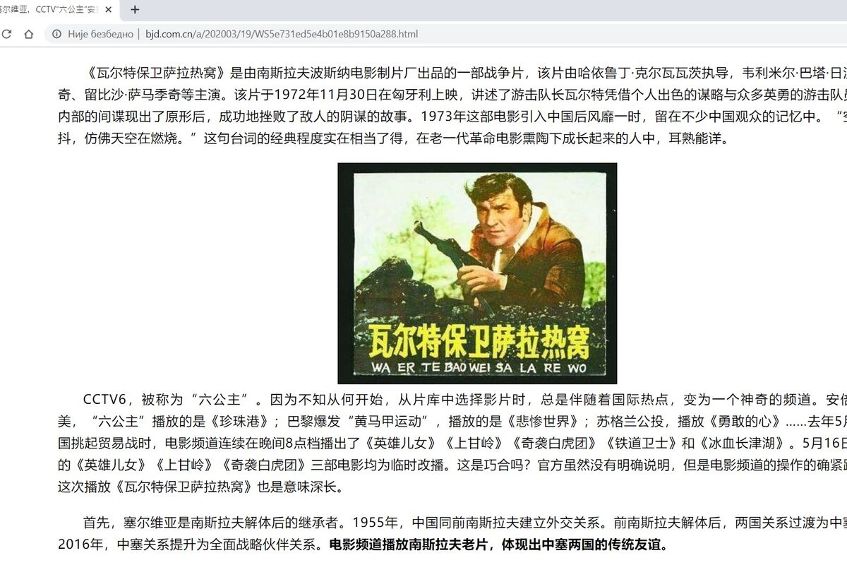 - Iako Sarajevo više nije u Srbiji, Sarajevo mnogo znači Srbiji. "Valter brani Sarajevo" odražava neumornu borbu potlačenih nacija pred stranim agresorima. Srbija se suočava s epidemijom korona virusa i sada joj je potrebna upravo takva odlučnost, hrabrost i borba - piše između ostalog u tekstu na sajtu www.bjd.com.cn.