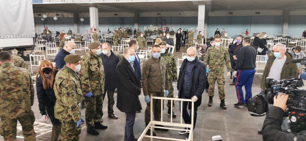 Pripadnike Ministarstva odbrane, Vojske Srbije i volontere koji su angažovani na obezebeđivanju uslova za prihvat i smeštaj lica sa lakšom kliničkom slikom virusne infekcije Kovid 19, u Master hali novosadskog sajma, obišli su danas gradonačelnik Novog Sada Miloš Vučević, ministar odbrane Aleksandar Vulin, pokrajinski sekretar za zdravstvo Zoran Gojković i major Prve brigade kopnene vojske Srbije Nedeljko Nedeljković.