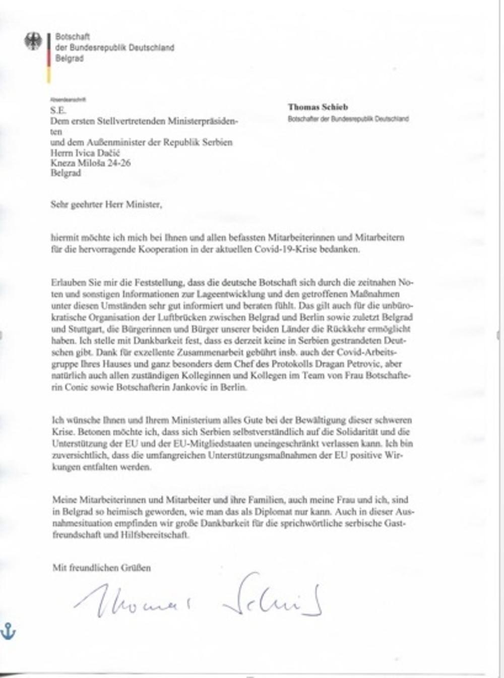 Pismo zahvalnosti Savezne Republike Nemačke: