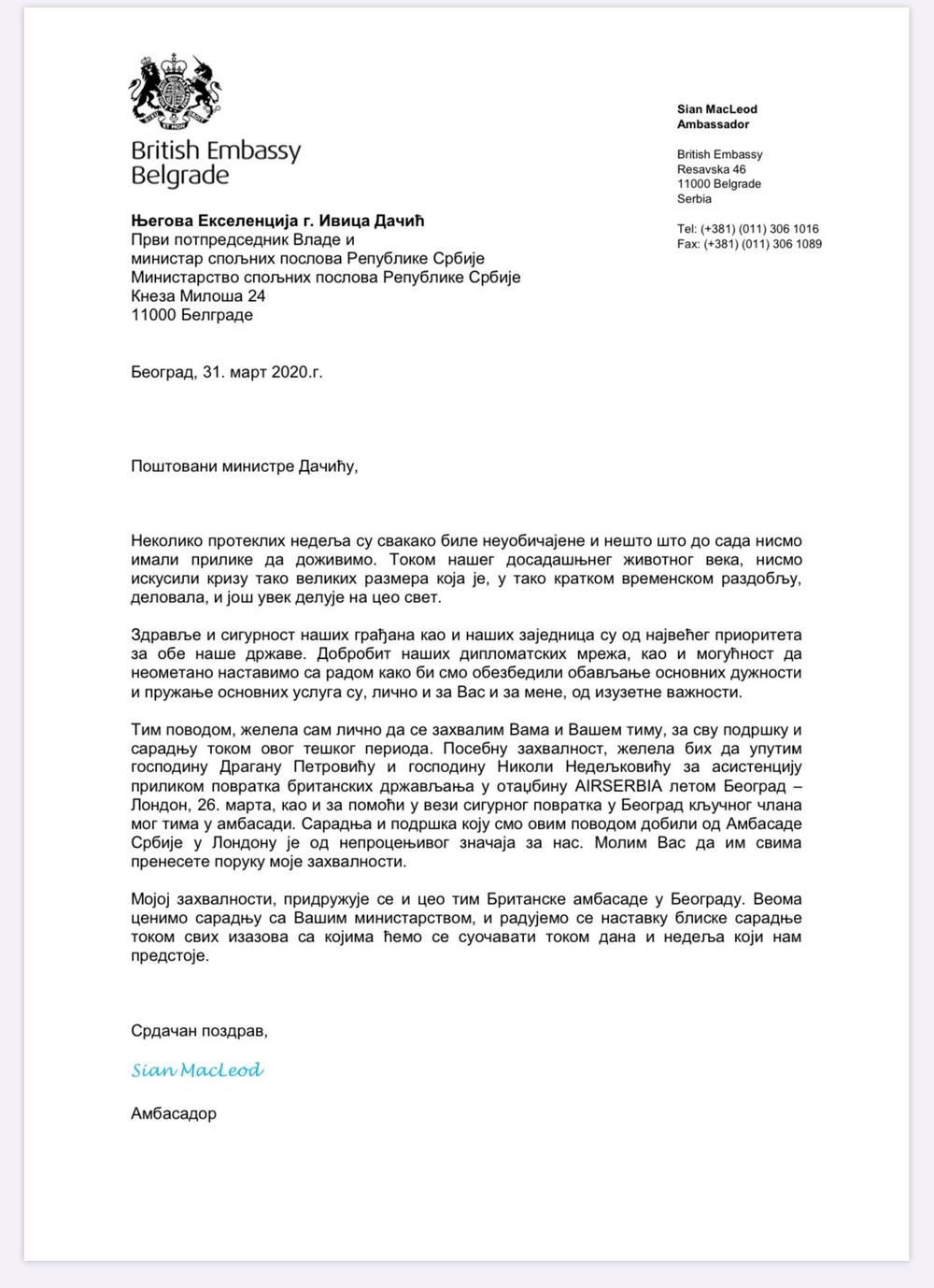 Tim povodom, želela sam lično da se zahvalim Vama i Vašem timu, za svu podršku i saradnju tokom ovog teškog perioda. Posebnu zahvalnost, želela bih da uputim gospodinu Draganu Petroviću i gospodinu Nikoli Nedeljkoviću za asistenciju prilikom povratka britanskih državljana u otadžbinu Air Serbia letom Beograd - London, 26. marta, kao i za pomoć u vezi sigurnog povratka u Beograd ključnog člana mog tima u ambasadi.