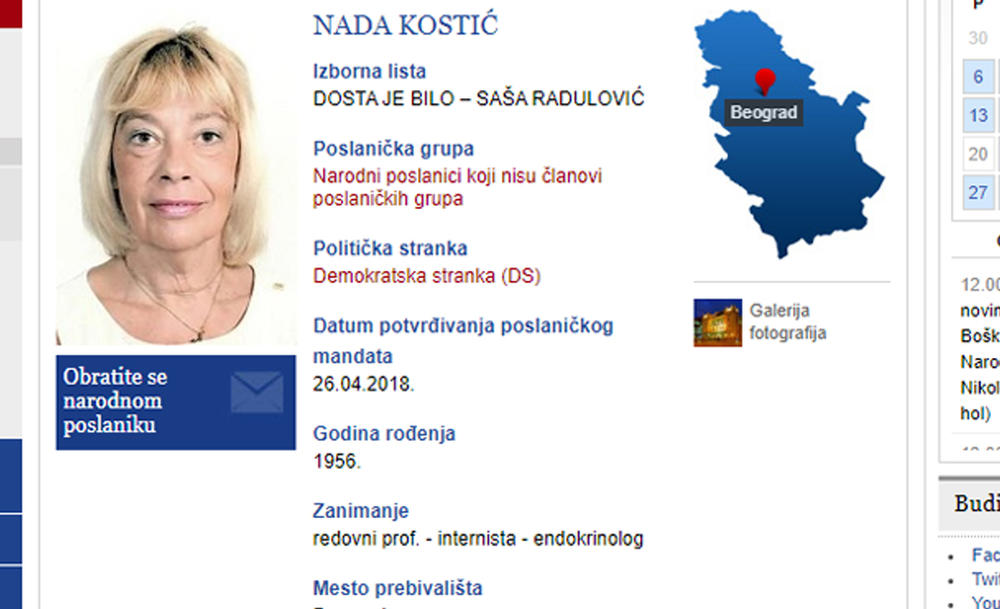 Skupština Srbije bila je poprište neverovatnog performansa od strane redovnog profesora Medicinskog fakulteta, doktorke Nade Kostić. Kostićeva je u ovaj saziv parlamenta ušla preko liste Dosta je bilo Saše Radulovića.