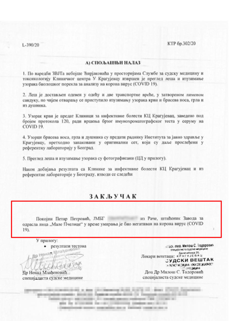 Tužilac Dejan Veljković iz Kragujevca kaže za naš list da ekshumaciju naređuje sud, ali na predlog policije zbog sumnje da je štićenik umro od kovida. Na pitanje zašto ekshumacija ako postoji sumnja da je neko umro od kovida i šta se time dokazuje, Veljković je rekao: - Jer nije urađen test na koronu, stanje je vanredno... Izvršena je ekshumacija, testovi su bili negativni i na tome je završeno.
