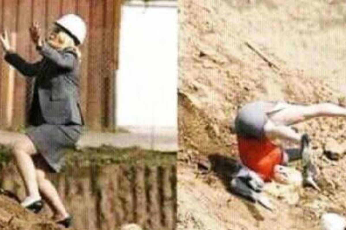 Ona je navodno uhvaćena na fotografiji kako pada sa jednog gradilišta, ni manje ni više, nego na glavu, sa sve nogama u vis.