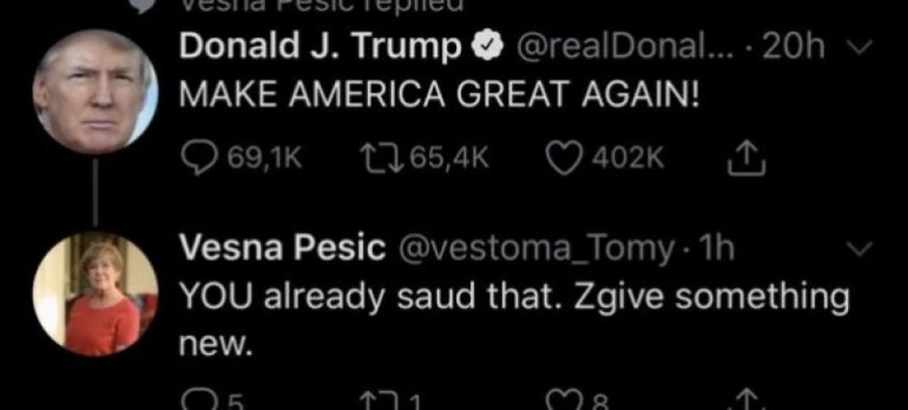 Poznata tviterašica Vesna Pešić veoma je aktivna na svom Tviter nalogu, a ovog puta je uputila odgovor na tvit Donalda Trampa.
