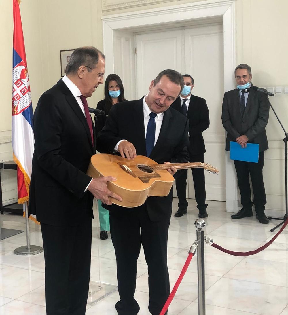 Ministar spoljnih poslova Ivica Dačić nije danas krio zadovoljstvo posetom šefa ruske diplomatije Sergeja Lavrova, pa mu je na kraju zajedničke konferencije za novinare poklonio gitaru.