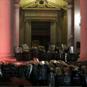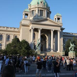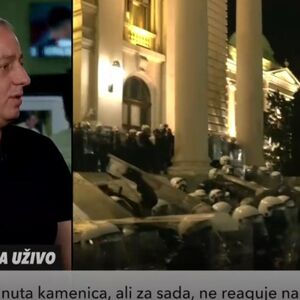 Na kapiji se tek nakon 15 minuta pojavila grupa policajaca u punoj opremi za razbijanje demonstracija kojima su skandirali "Sluge režima", "Mi vas plaćamo", "Bacite štitove"...