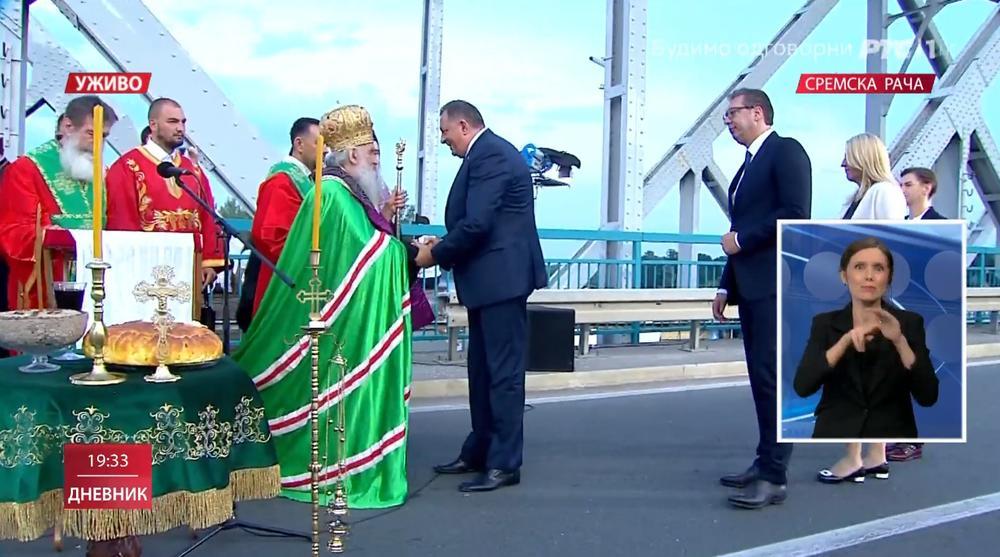 Simbllično, Vučić i Brnabić sreli su se sa Dodikom i Cvijanović na pola mosta u Rači, gde patrijarh Irinej služi pomen nastradalim Srbima