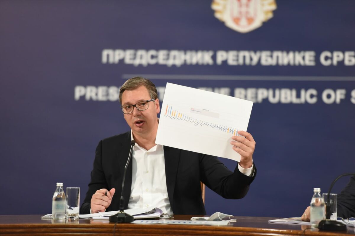 - Što se tiče ekonomije, Srbija je u ovom trenutku na minus 6,5 i samo je Litvanija ispred nas sa boljim rezultatima u drugom kvartalu i to je samo zbog toga što nisu imali toliko ozbiljnu situaciju sa koronavirusom. Nemamo podatke za Irsku, moguće je da će oni imati bolje rezultate, ali trenutno nema tih podataka. Nesumnjivo je da će Srbija biti najbolja od svih zemalja u regionu, u prvom kvartalu smo bili prvi po ekonomskim rezultatima. Naravno, ovo ne znači da ljudi žive kao bubreg u loju, ali znači da ćemo proći bolje nego drugi. Ovaj novi paket ekonomskih mera se odnosi i na preduzeća osnovana od marta meseca. Nemamo manje zaposlenih, imamo nešto veći broj zaposlenih, ali tek očekujemo neke udare, ali preventivno smo uradili sve što smo mogli i efikasno ćemo odgovoriti na njih i u budućnosti. Ekonomski paket mera iznosi 5,8 milijardi evra do sada, što je 12 posto bruto domaćeg proizvoda - naglasio je Vučić.