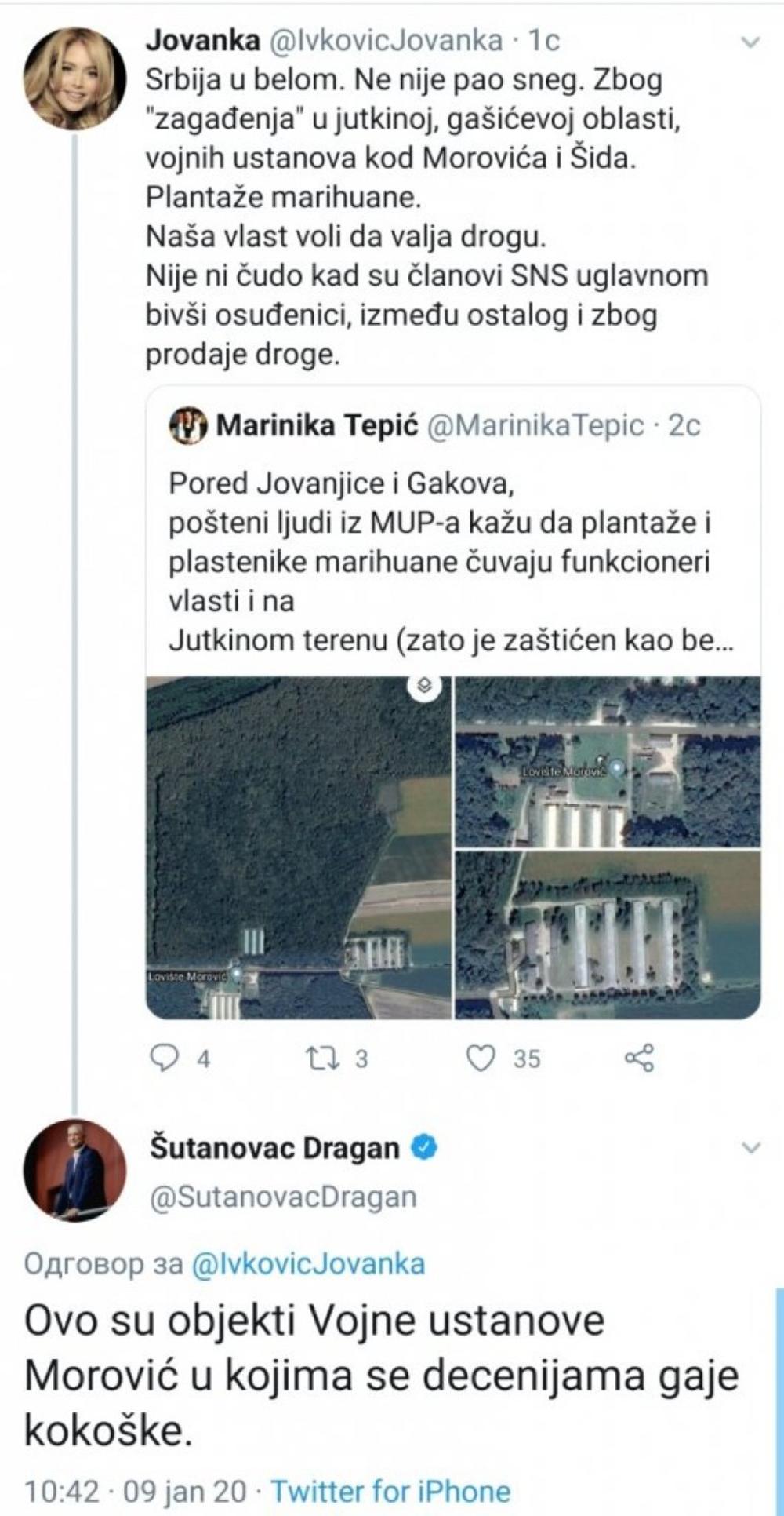 U januaru ove godine Marinika Tepić je ustvrdila da se na farmi Vojne ustanove Morović pored Šida nalazi najveća državna plantaža narkotika.