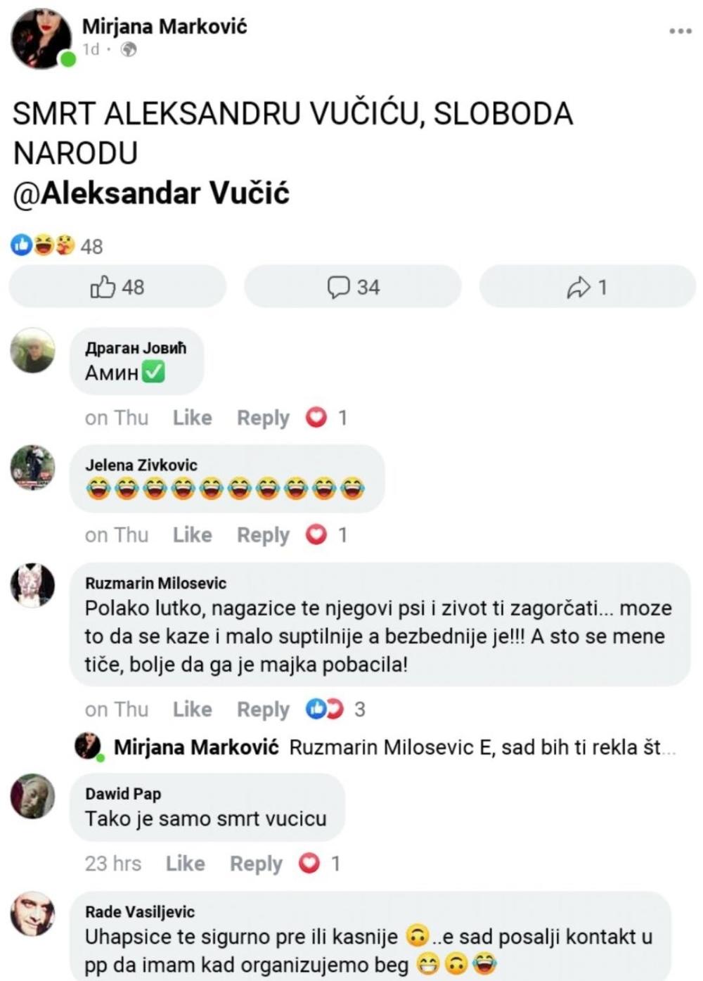 Izvesna Mirjana Marković, sudeći po fotografijama pripadnica pokreta "1 od 5 miliona", želi smrt Vučiću.