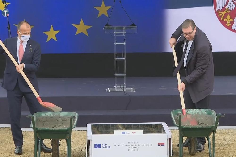 Predsednik Srbije Aleksandar Vučić prisustvovao je danas svečanom postavljanju kamena-temeljca za izgradnju intermodalnog terminala u Batajnici.