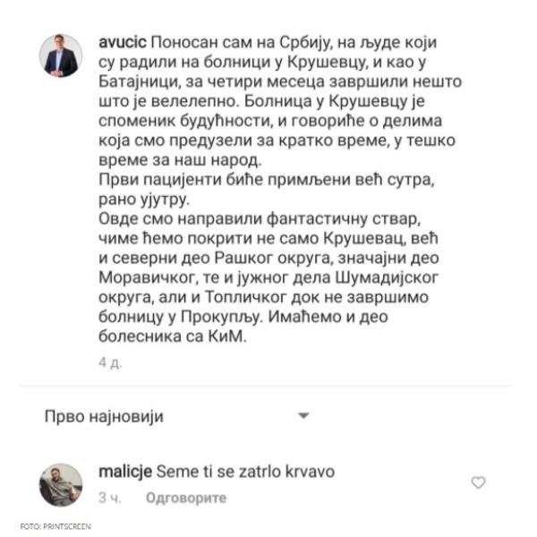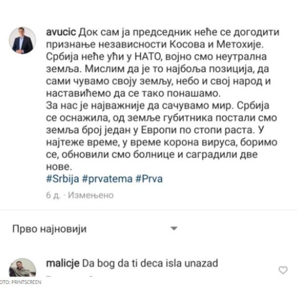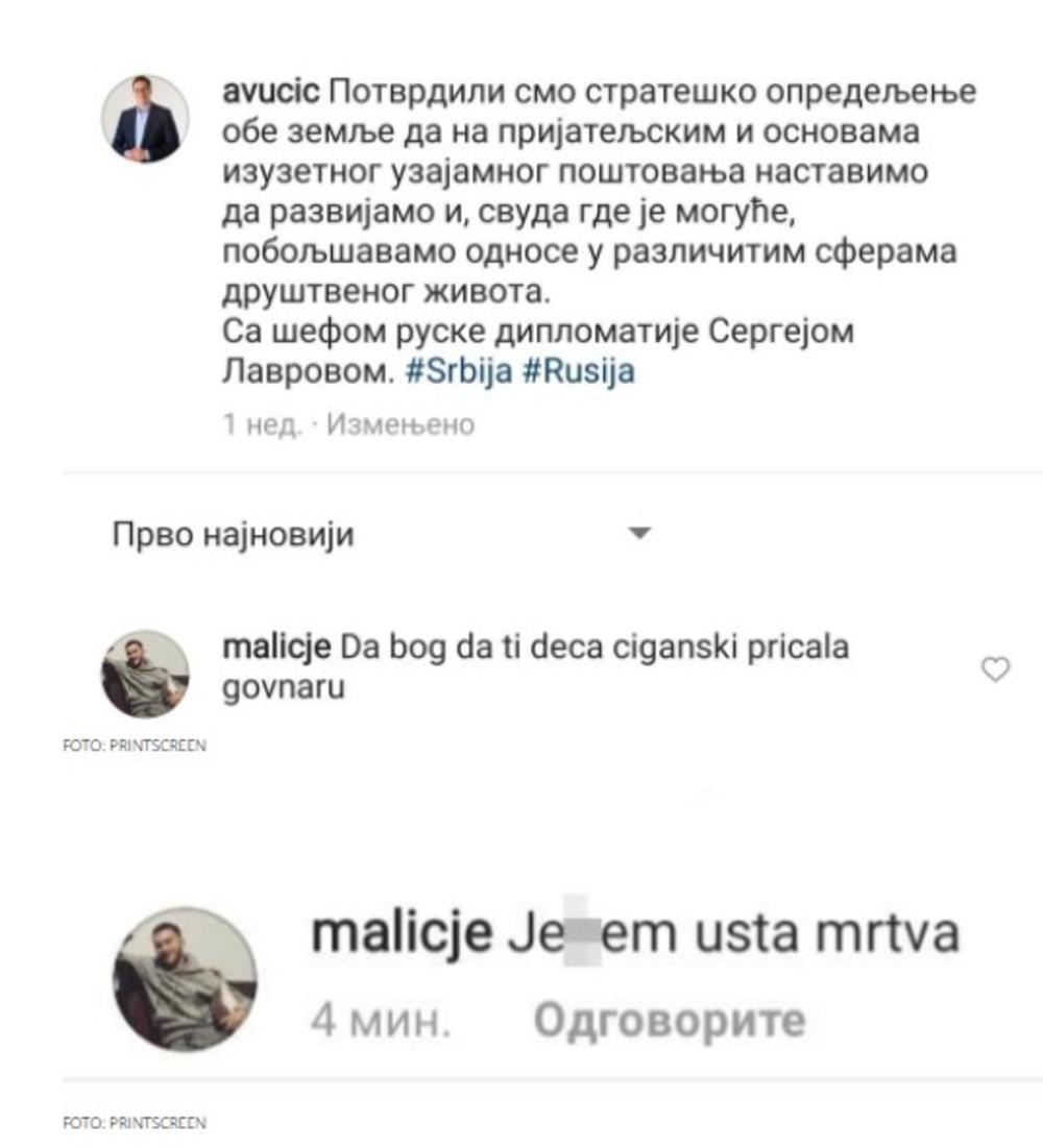 Na Instagramu nalogu predsednika Srbije, ispod njegovih komentara dnevnih aktivnosti, oglasio se izvesni Malicje sa monstruoznim uvredama i pretnjama na račun predsednika Vučića i njegove dece.