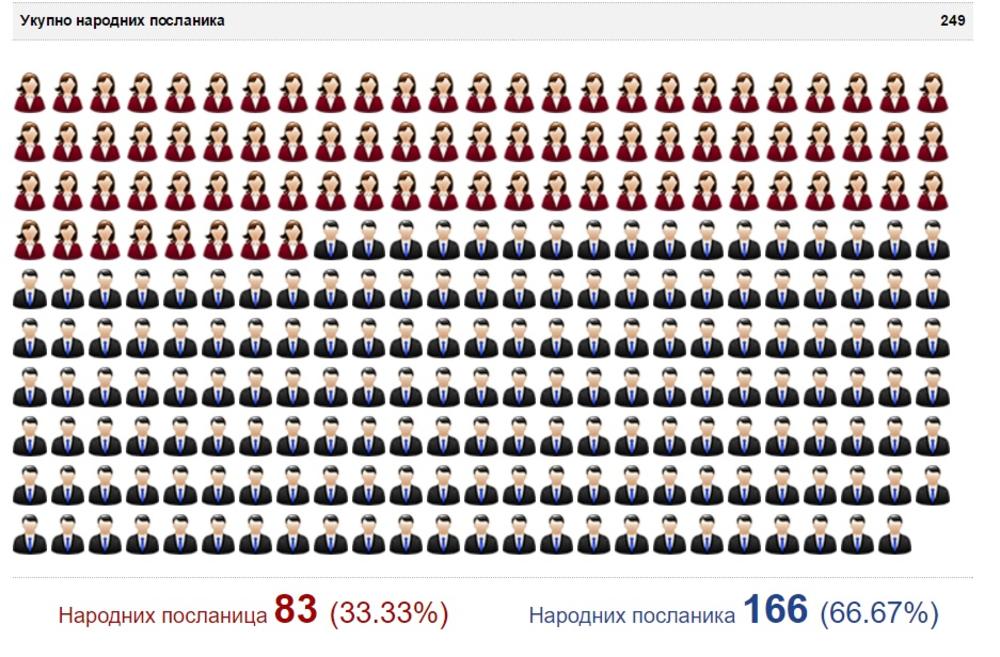 Od 249 poslanika većinu čine muškarci, čak 66,67 odsto. Dakle, prosečan srpski poslanik je muškog roda.