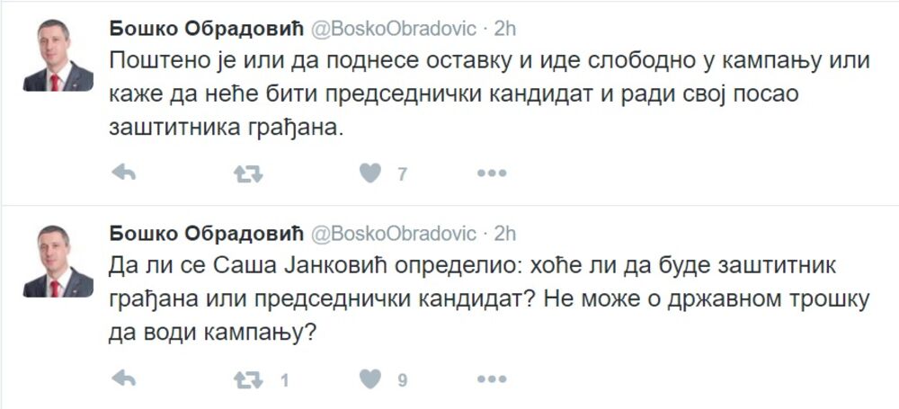 - Pošteno je da donese ostavku i ide slobodno u kampanju - napisao je Obradović na Tviteru.