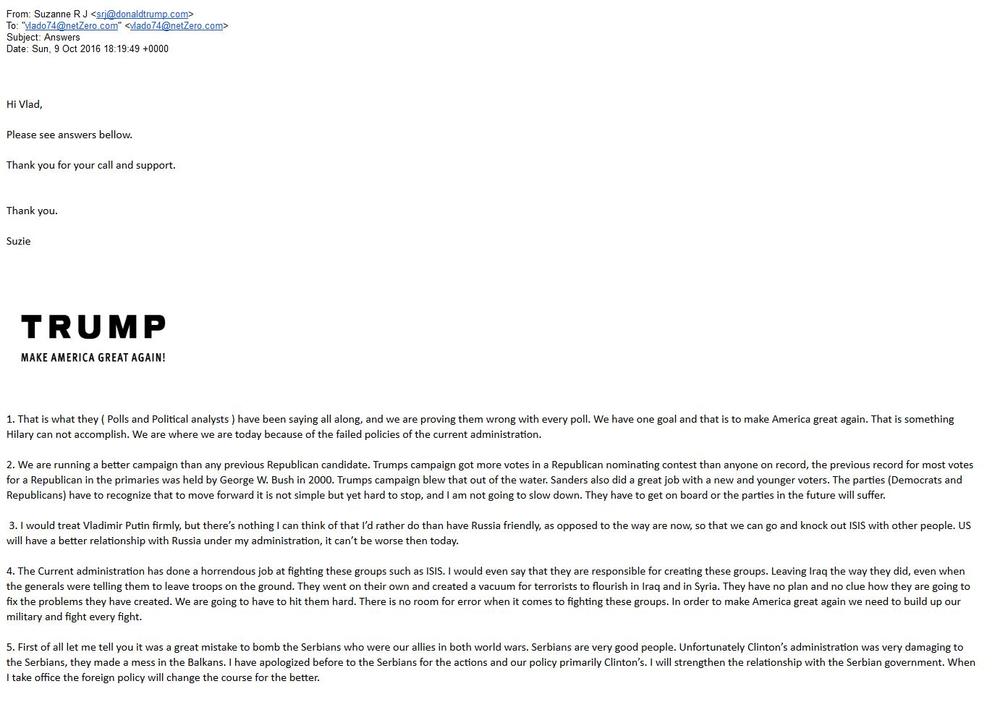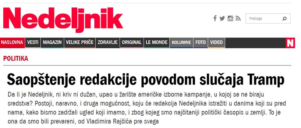 "Stigli su rano ujutru po srpskom vremenu, svega nekoliko časova posle druge debate Donalda Trampa i Hilari Klinton. Mejl koji smo dobili potpisuje Suzan Javorovski, inače šefica izbornog štaba kampanje Donalda Trampa za Indijanu i jedna od viših medijskih savetnika Donalda Trampa", navodi list. Takođe, Nedeljnik navodi da im je rečeno da je Tramp "saslušao pitanja jer su mu važni glasovi Amerikanaca srpskog porekla", a uz redakcijsko saopštenje su objavljene i slike Rajčića sa Trampovim potencijalnim potpredsednikom SAD Majkom Pensom i Suzan Javorovski, koje je on pružio kao dokaz verodostojnosti. Nedeljnik navodi da će u narednim danima istražiti da li je prevaren i uputio je izvinjenje čitaocima. "U tom slučaju, krivica je naša i samo naša. Poverovali smo sagovorniku koji nam je obezbedio dokaze koje smo tražili, i nismo ispunili svoju profesionalnu dužnost da do kraja sumnjamo u njih. Ne iz zle namere i nikako u želji da svoje čitaoce dovedemo u zabludu, zbog čega im se unapred i u svakom slučaju, ma šta da bude ishod ove zavrzlame, izvinjavamo", navodi se u Nedeljniku.