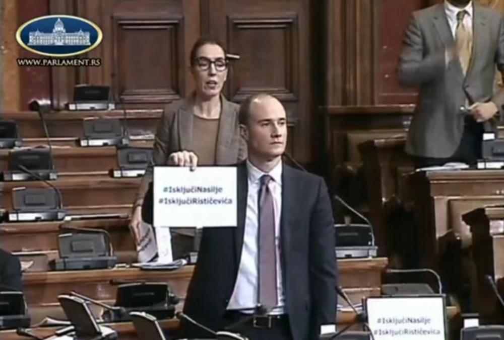 Svađa je usledila pošto predsednica Skupštine Maja Gojković nije dozvolila poslanicima opoziciije da na svoj način iskažu protest protiv uvreda poslanika Marijana Rističevića.