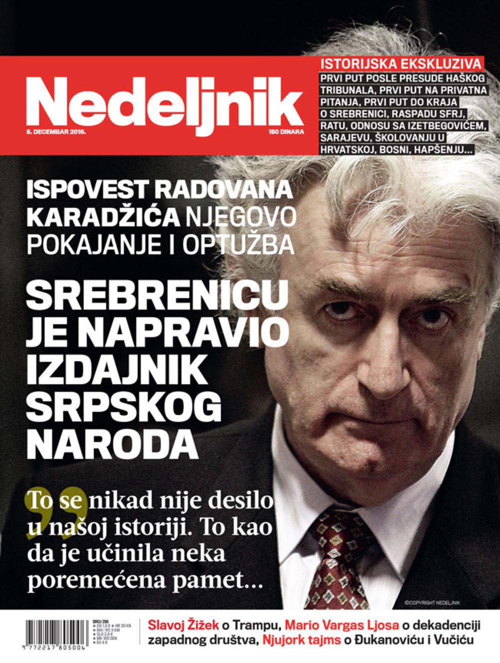 Radovan Karadžić je - uz napornu i dugačku proceduru sa potpisivanjem nekoliko dokumenata iodobrenjem samog Suda i, u ovom slučaju, osuđenika - pristao da, posle nemačkog Cajta, u svom prvom intervjuu za srpske medije posle presude Tribunala, i pošto je osuđen na40 godina zatvora, zbog genocida u Srebrenici i zločina protiv čovečnosti nad Muslimanima i Hrvatima tokom rata u Bosni i Hercegovini - za Nedeljnik odgovori na pitanja o ratnim dešavanjima devedesetih, svojoj ulozi u tim događajima, o uzrocima i posledicama, ko je kriv za raspad Jugoslavije, o zločinima, Srebrenici, svom hapšenju i izručenju...