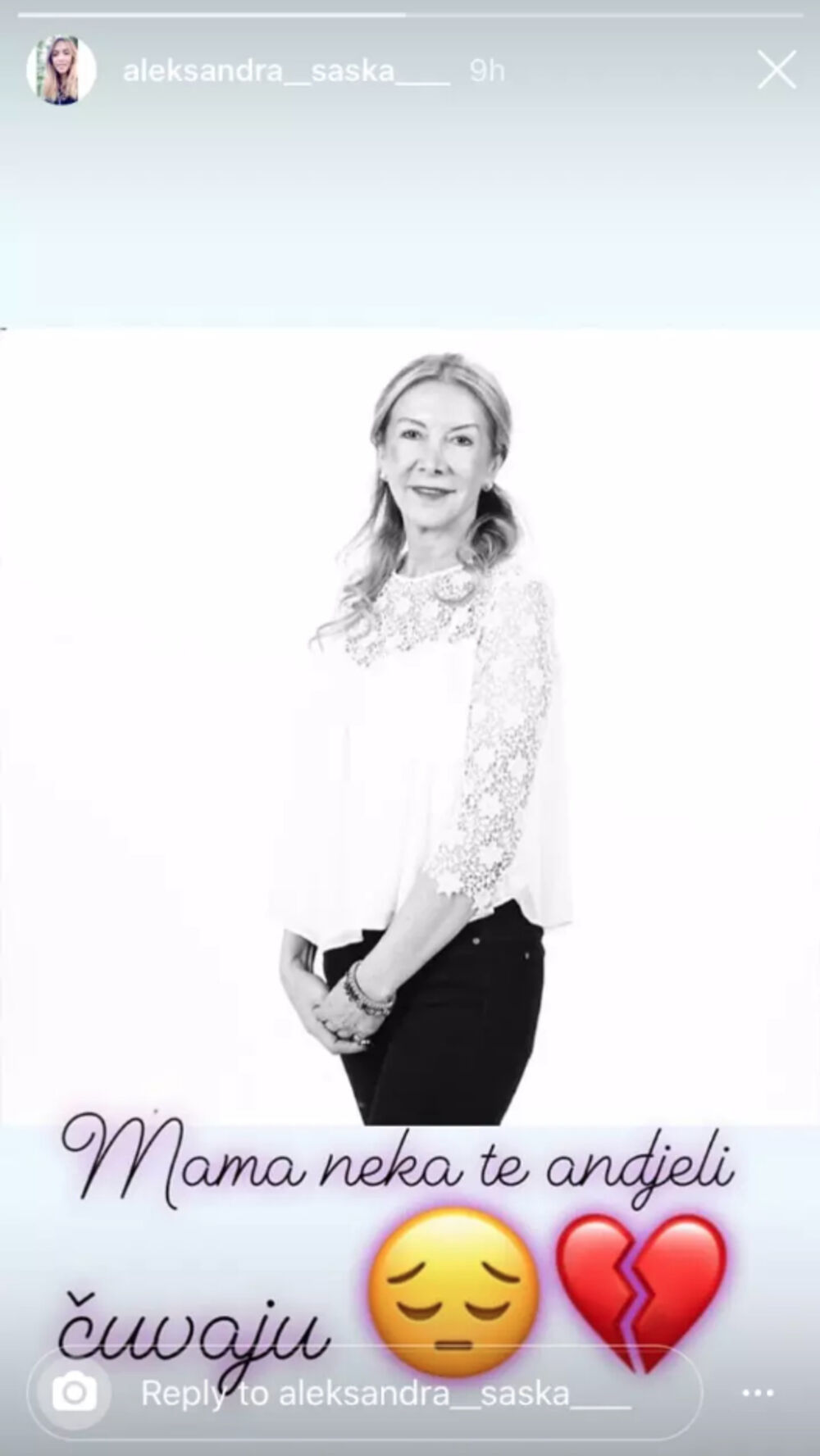 - Mama, neka te anđeli čuvaju - napisala je Aleksandra i stavila emotikon slomljenog srca.