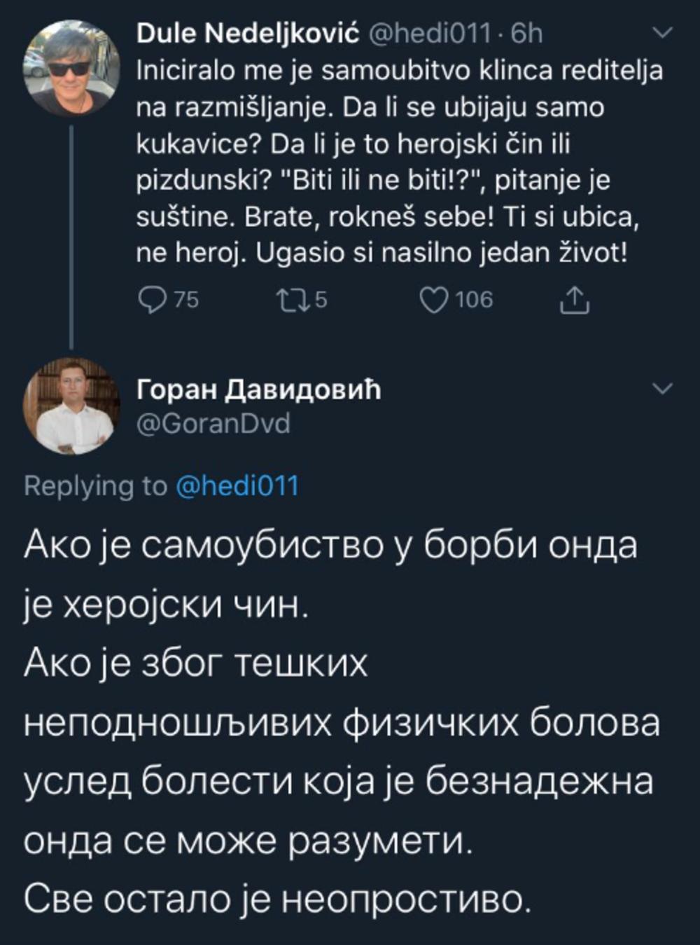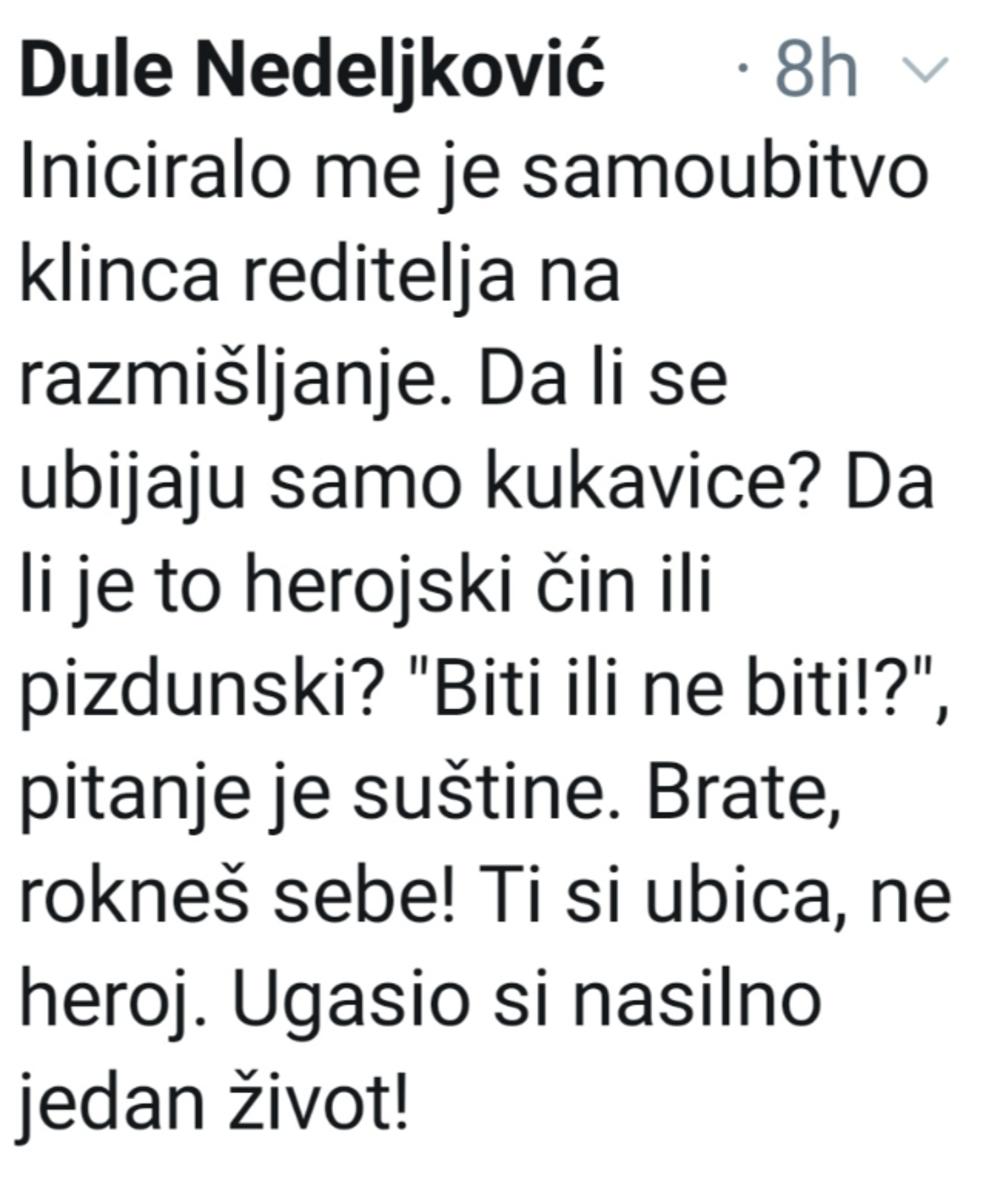 DA LI JE SAMOUBISTVO HEROJSKI ILI PIZDUNSKI ČIN? TI SI UBICA, NE HEROJ! Tvit Duleta Nedeljkovića razbesneo mnoge