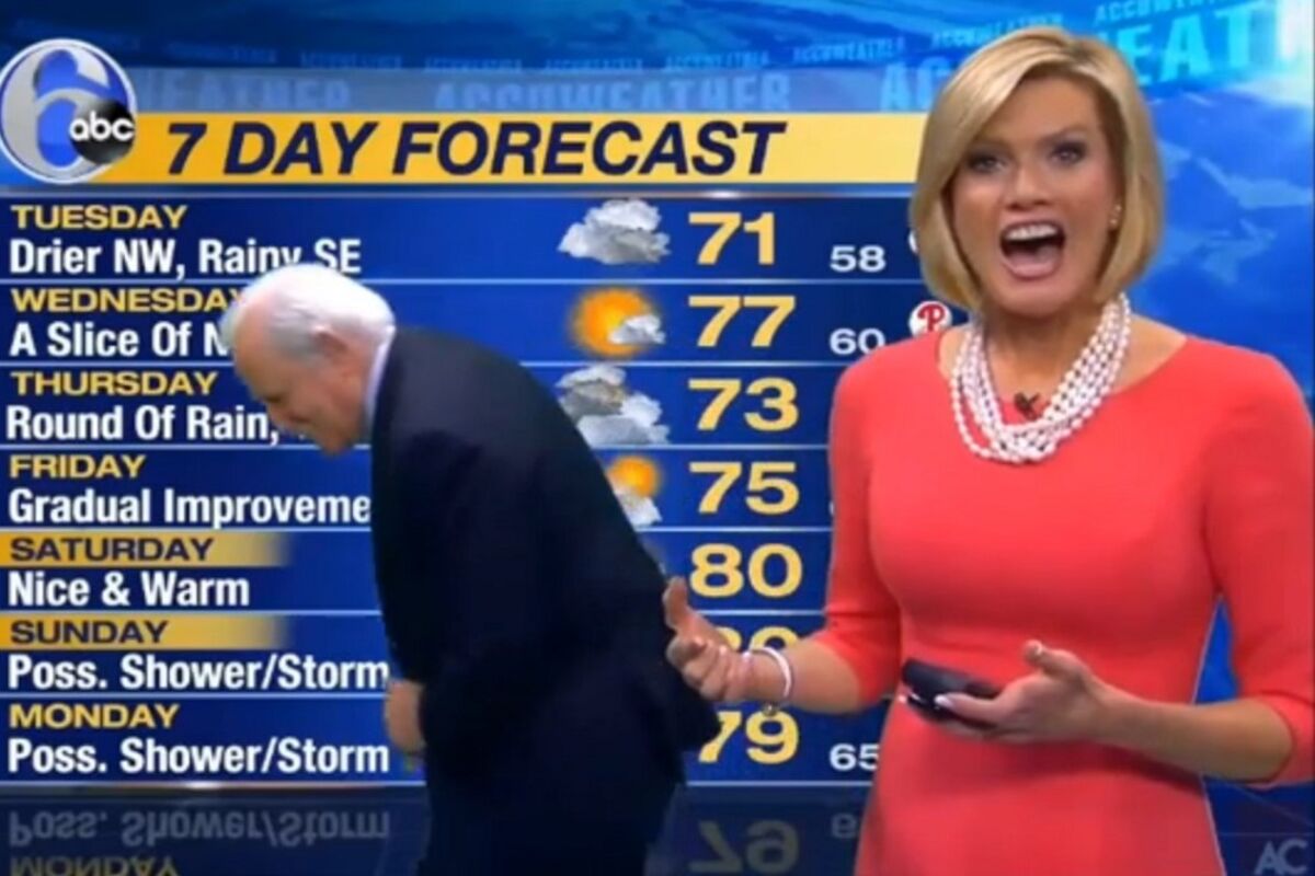 Voditeljka čita vremensku prognozu, ali zašto dekica tumara iza nje? (VIDEO)
