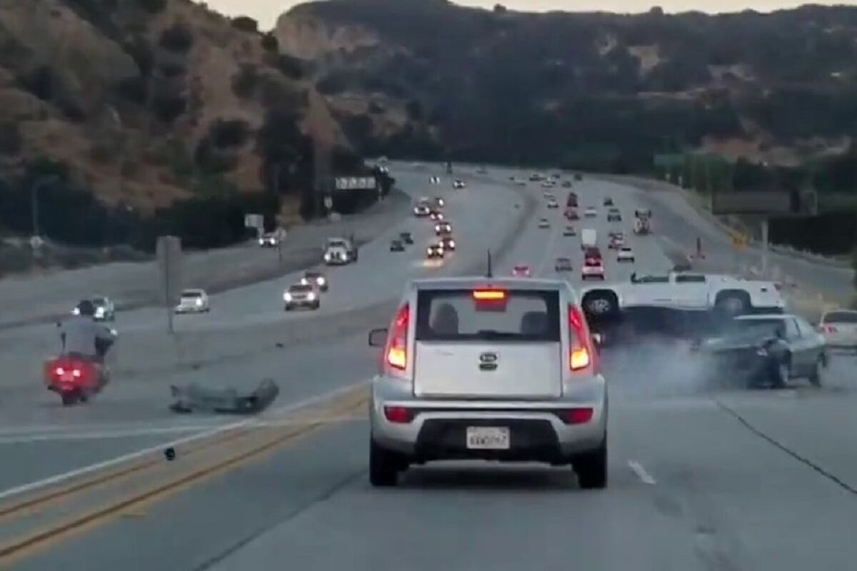 Ko je koga pretekao, "isekao" na putu ili nešto treće, tek sukob motocikliste i vozača automobila prerastao je u žestoki udes na autoputu u blizini kalifornijskog grada Santa Klarita. Što je najgore, na snimku se vidi kako je incident počeo, ali i da je najdeblji kraj izvukao vozač kamioneta koji nije bio ni kriv ni dužan.