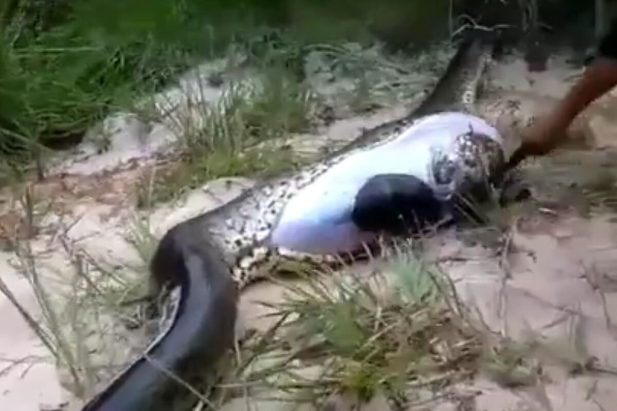 Nakon što ga je stegla i slomila zmija ga je celog progutala.