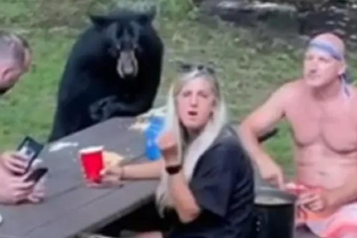 I sve je bilo u redu, dok jedan krupni crni medved nije nonšalantno prišao ljudima i pridružio se zabavi, i to nalakćen na sto, kao pravi baja.