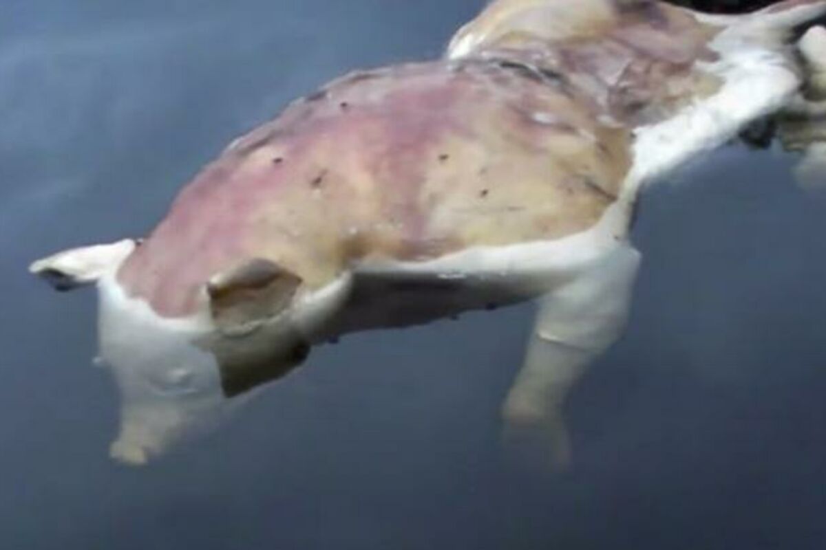 Na prvi pogled leš koji pluta na vodi izgleda kao svinja, ali su autore videa zbunile "ljudske" ruke i ravan rep.
