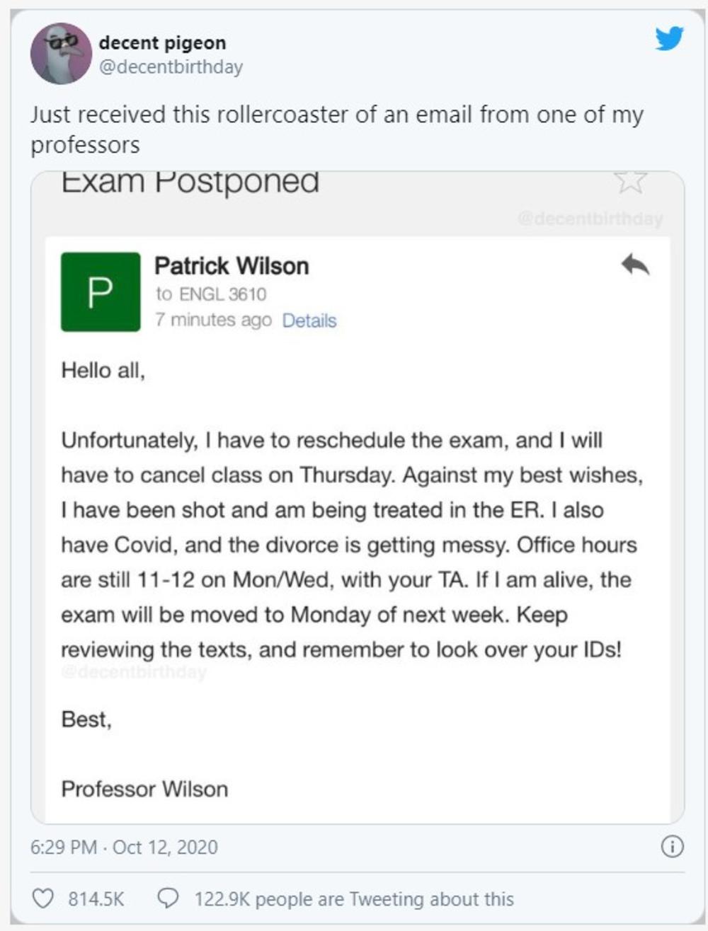 Obaveštenje koje je navodno jedan profesor poslao svojim studentima kako bi ih obavestio da odlaže ispit postalo je viralno zbog bizarnih razloga koje je naveo.