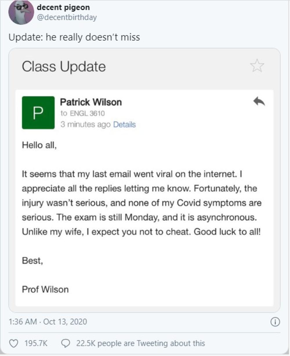 - Čini se da je moj poslednji imejl postao viralan. Hvala vam na obaveštenju. Srećom, moja povreda nije bila ozbiljna, kao ni moji simptomi kovida. Ispit se i dalje održava u ponedeljak. Nadam se da nećete varati kao moja žena. Srećno svima - stoji u objavi.