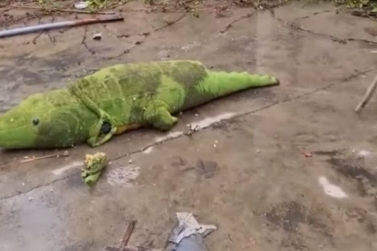 Dve devojke i mladić su primetili da se u velikom plišanom krokodilu nešto pomera, te su odlučili da vide šta se unutra nalazi.