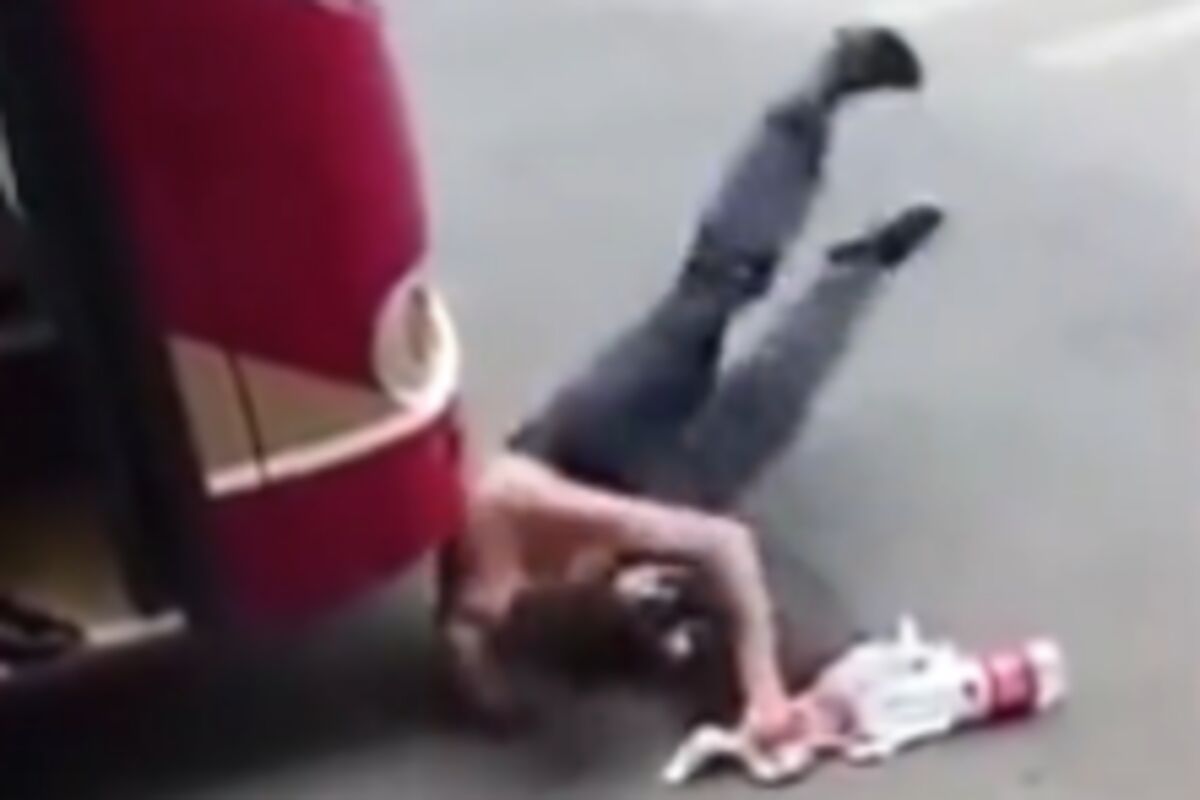 On se uporno bacao na autobus, ne bi li ispalo da ga je vozilo "zveknulo", ali okupljeni narod mu se samo smejao, zajedno sa policijom, koja ga je na kraju odvela. Kakav bednik.