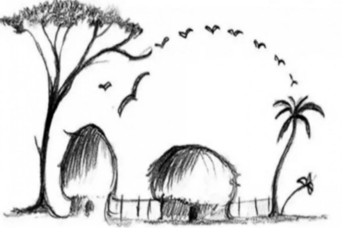 Ova iluzija prikazuje scenu prirode, dva drveta, jato ptica koje kruže iznad i dve kolibe.