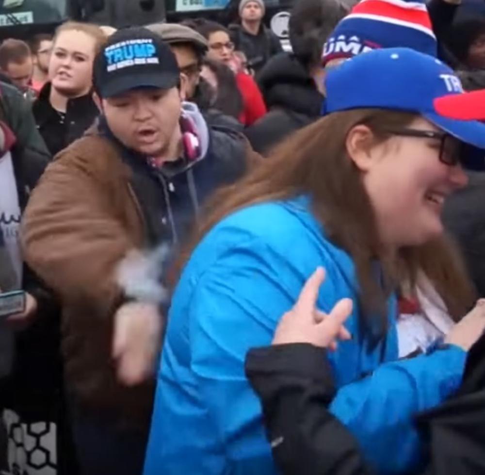 Jedna devojka je odlučila da, iz čista mira, zapali kosu drugoj, koja je pristalica Donalda Trampa. Kada je kosa počela da se dimi, jedan od fanova novog predsednika je priskočio u pomoć i ugasio plamen.