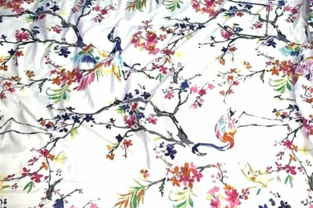 Pred vama je fotografija posteljine koja je oslikana pticama i cvećem.