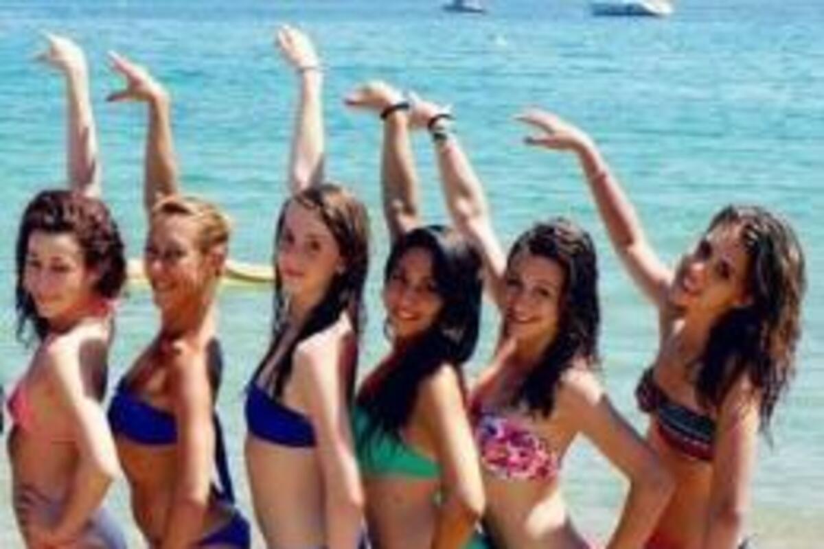 Grupa devojaka pozirala je u atraktivnoj pozi, potpuno nesvesna toga da još neko maše ka fotoaparatu, sa mora, iza njih.