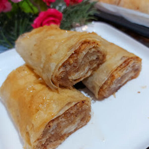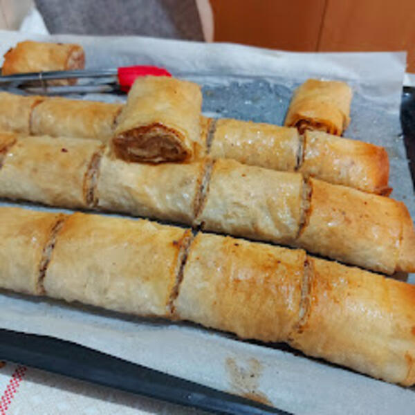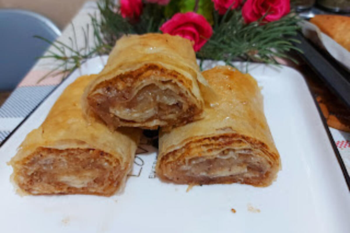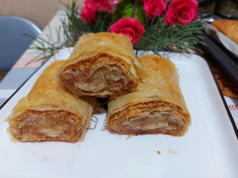 Prvu koru pouljiti, dodati drugu koru ulje, pa preko nje 2 kašike suvih sastojaka, dodati treču koru i nju pouljiti pa suve sastojke i rendane jabuke, i četvrta kora samo suve sastojke i uviti u rolat.
