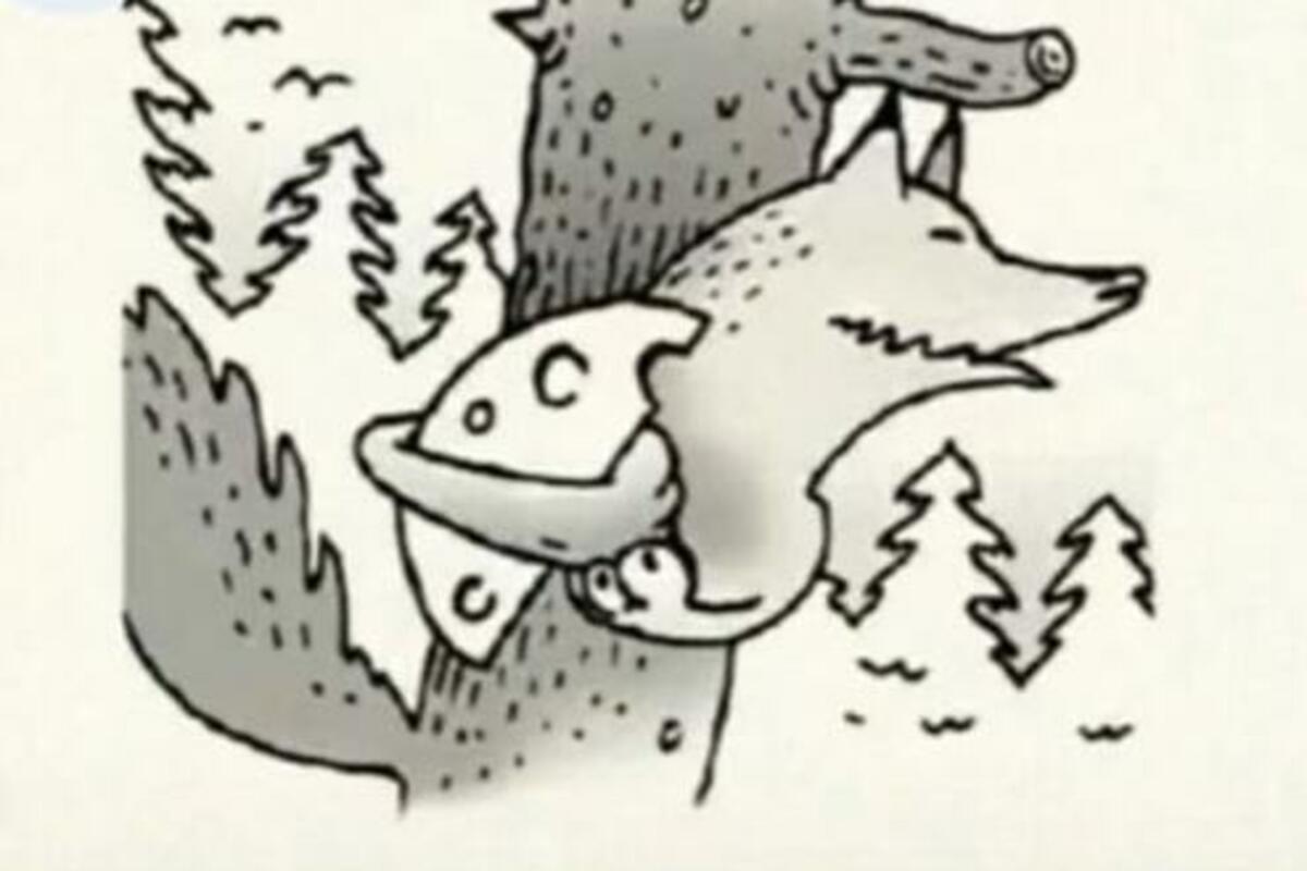 Ilustracija prikazuje pticu na grani drveta, koja u ustima drži svoj plen – komad sira. Ali, na slici se krije i jedna potpuno druga životinja.