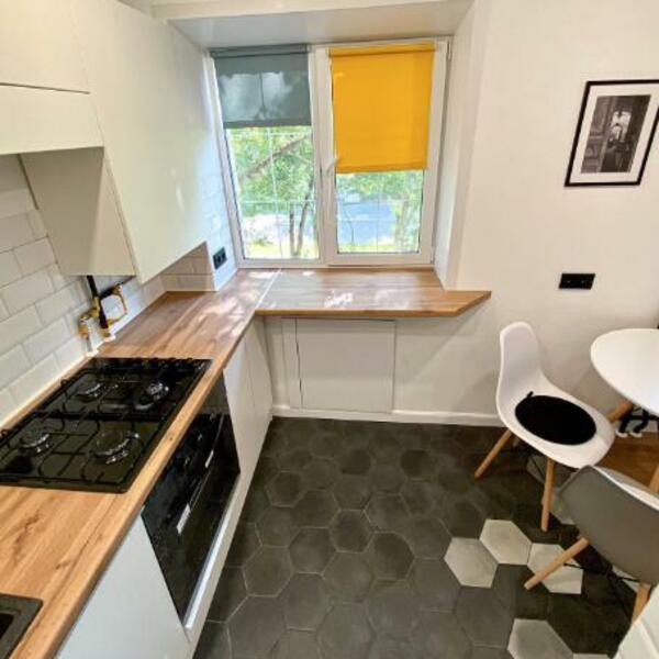 U dnevnoj sobi je postavljena sofa između ulaza u kupatilo i garderobe. Prostorija je izuzetno svetla i puna divnih detalja. Zbog nestandardnih dimenzija, kuhinja je rađena po meri. Kao podna obloga korišćene su šestougaoni porcelanske pločice od nekoliko nijansi. Kako bi se povećao prostor za kuvanje, deo radne površine prebačen je na prozorsku dasku.