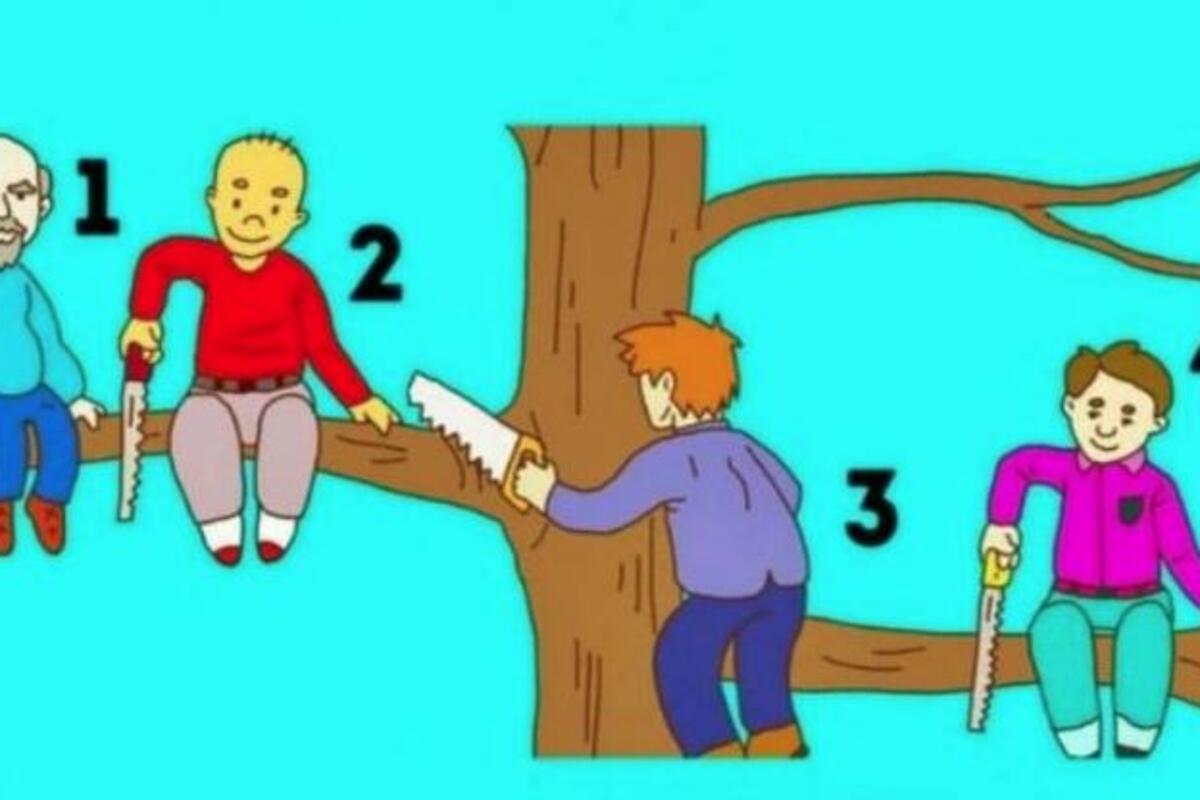 Na ilustraciji se vide četiri muškarca koji sede i stoje na drvetu, a trojica od njih drže testere i seku grane. Situacija se čini pomalo bizarna i budalasta, a vaš zadatak je da dobro pogledate sliku i kažete ko je po vašem mišljenju najgluplji od ove četvorice.