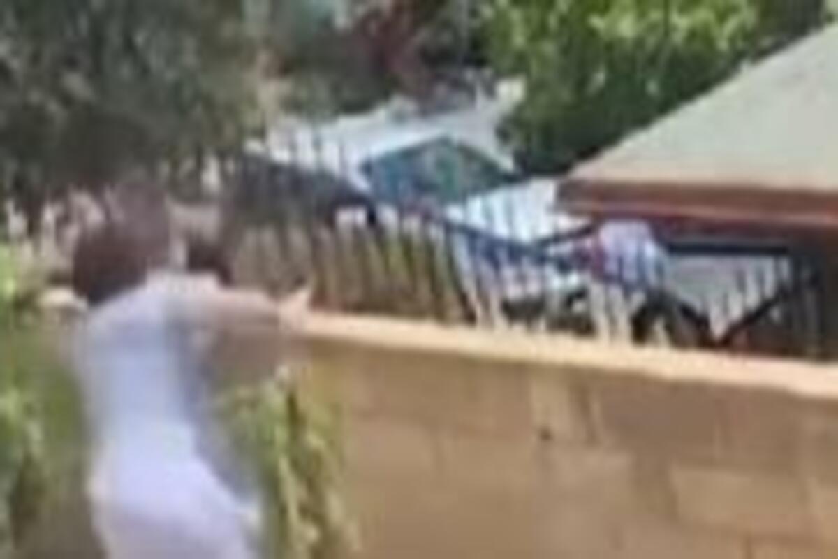 Žena, koja izgleda kao da je u spavaćici, goloruka izlazi pred medveda kako bi odbranila svoje pse. Ova žena nije imala kada da razmišlja i instinktivno je odreagovala rukama gurnuvši medveda sa zida. Medvedica je izgubila ravnotežu i pala sa zida koji nije bio preterano visok, dok je žena pokušala da hvata i spašava pse, noseći jednog u rukama. Dok žena hvata pse u pozadini se vidi medvedica koja takođe beži iz ovog dvorišta gde je napadnuta od strane svih.