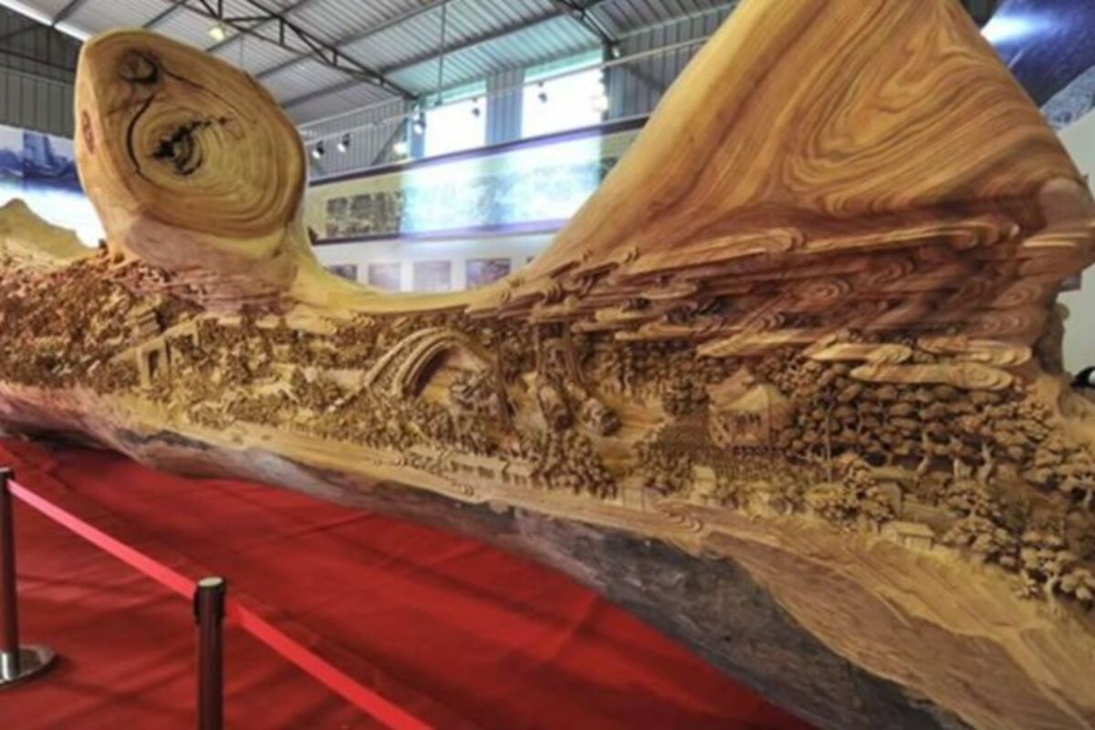 Talentovani autor je potrošio četiri godine pedantno i precizno rezbareći detaljnu repliku poznate slike tradicionalnog kineskog slikarstva u deblu od tri i po metra